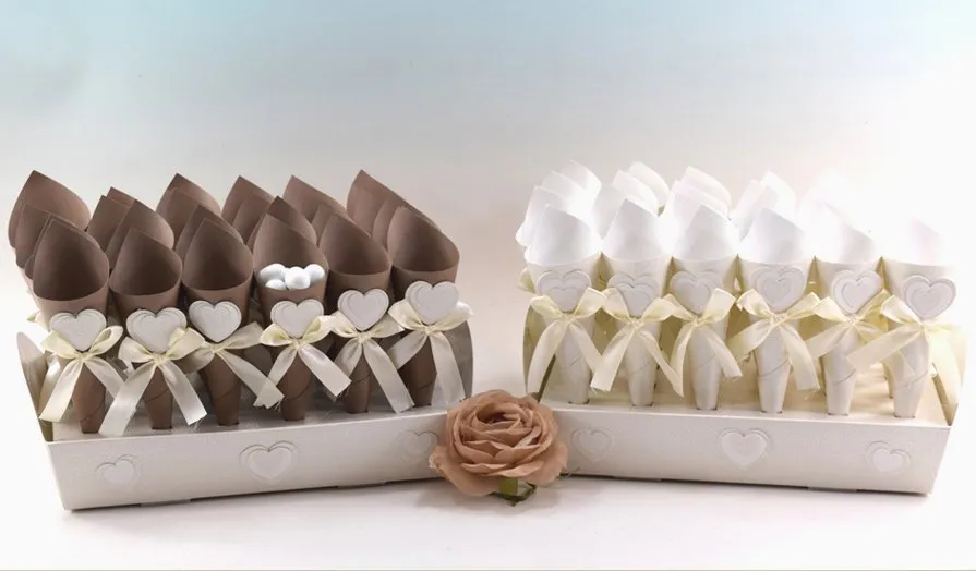 Bomboniere Vassoio con 24 coni TORTORA c/appl. CUORE e fiocco raso